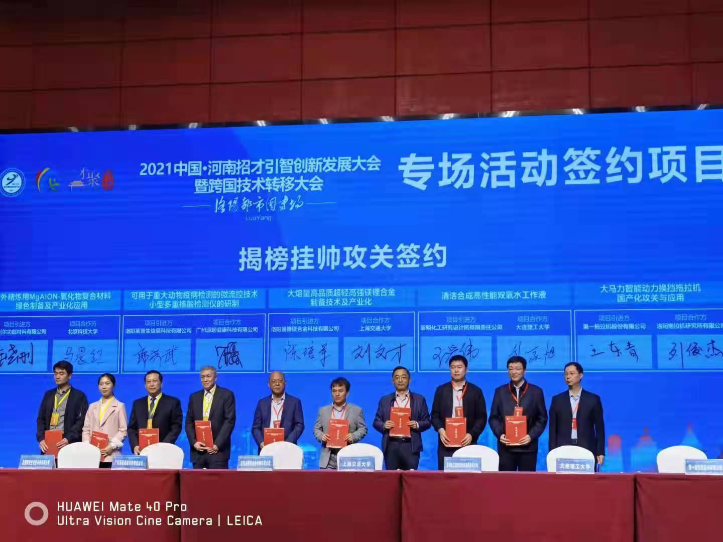 2021年10月15日,洛陽市舉辦“才聚河洛 2021中國?河南招才引智創新發展大會暨跨國技術轉移大會”。會上,洛陽晟雅鎂合金科技有限公司陳總與上海交通大學劉教授簽訂揭榜掛帥成果轉化技術合作協議,將有力推進高端鎂合金成果在洛陽以及河南轉化和產業化進程。
